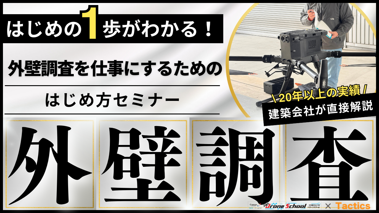本セミナーは、外壁調査の実務に20年以上携わってきた建築会社が運営する 「ドローンスクール東京立川校」と、 ドローン導入・運用支援を行うTacticsの共同開催です。